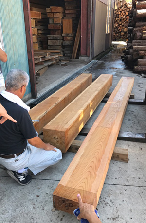 先日、M様邸の大黒柱・梁・カウンター材 等々を見に佐野市の材木店さんに行って来ました。